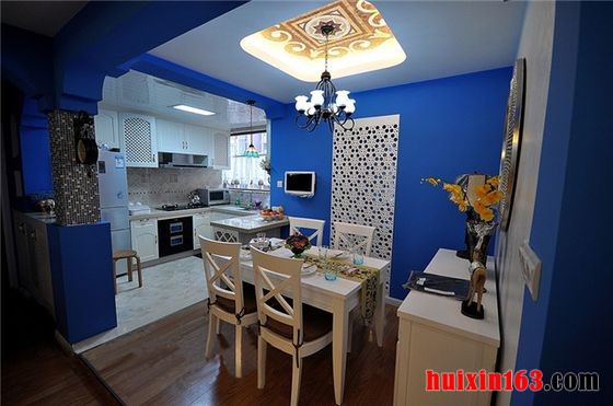 餐厅的整体设计也是离不开蓝色装饰的,蓝色的墙面颜色布置犹如生活在海洋中一样清新自然,白色的实木餐桌椅的搭配让空间的简洁明亮感更加的充分,墙面上一个实木的造型雕花的装饰让餐厅的立体感打造更加的突出,白色的石膏板吊顶设计一个嵌入式的印花灯饰让顶面装饰不再单调如一。