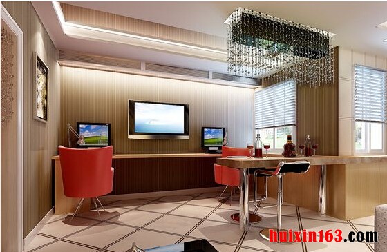 现代简约的装修模式运用在这种面积的住宅中是非常合适的,客厅的打造犹如酒吧环境一样浪漫和奢华,红色的沙发座椅让空间的颜色搭配更加的热情和舒适,实木的电视背景墙的设计更是为装修的档次带来很大的提升,一个实木的吧台打造可以是饮酒的好去处更是闲谈的悠闲空间。白色的软装沙发的搭配和一个紫色的水晶吊灯的运用瞬间把客厅的奢华时尚感提升到最高。