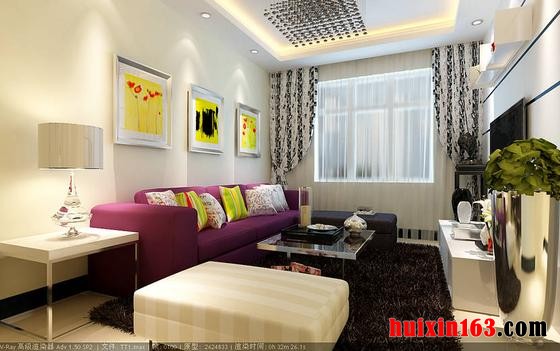 现代简约的装修风格展现出的时尚和前卫的装修韵味是比较浓烈的,客厅的整体装饰比较新颖和独特,白色的石膏板吊顶加深了空间的延伸感,水晶吊灯的使用更是让空间的华丽设计更突出,黑色的大面积的地毯的铺设让装修的档次和舒适性能有很大的提升,仔细的整套沙发搭配白色的小沙发的装修设计既华丽又展现出简约时尚的小清新感觉,紫色产生的浪漫舒适氛围比较浓郁,沙发背景墙上三幅黄色的装饰画的存在起到明亮空间的作用,一个大型的白色纱窗搭配黑白相间的窗帘使用产生的雍容华贵装饰感是比较明显的。